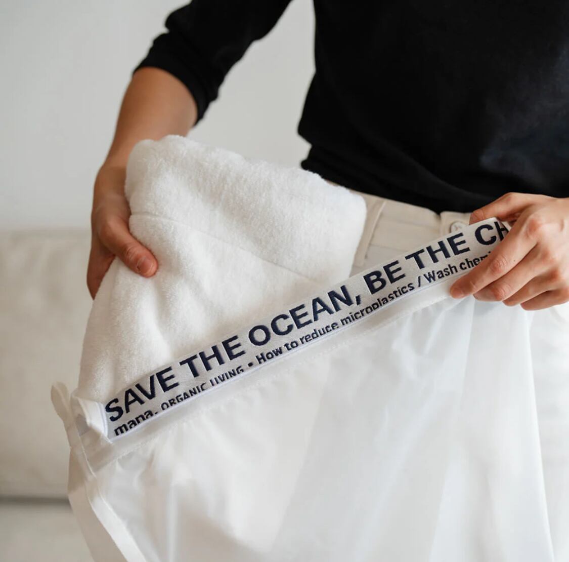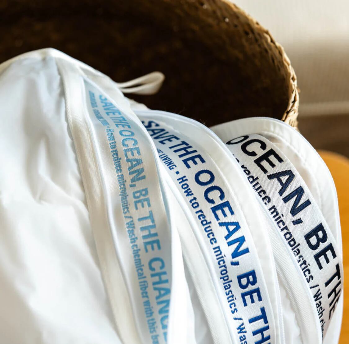 フリースやスポーツウェア、速乾性インナーなどの化学繊維製品は洗濯時の繊維脱落量が多いといわれ、そのまま洗濯するとその繊維がマイクロプラスチックとなり、海に流れていきます。プランクトンと間違えそれを食べた魚から、まわりまわって私たちの口に入っているという現状があります。